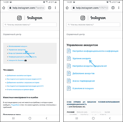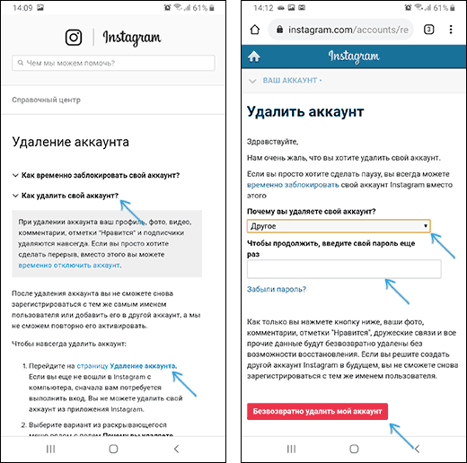 • На наступній сторінці, якщо ви хочете видалити акаунт Instagram повністю, а не тимчасово, натисніть «Як видалити свій обліковий запис», а потім — у першому пункті за посиланням «Перейдіть на сторінку Видалення облікового запису» (вас можуть запитати, чи потрібно відкрити сторінку в браузері або додатку Instagram, вибір не важливий). Вкажіть причину видалення, введіть пароль вашого облікового запису і, на завершення, натисніть кнопку «видалити мій акаунт».