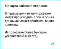 - Якщо по завершенні процесу ви побачите повідомлення «SD-карта працює повільно», це говорить про те, що ви використовуєте картку пам’яті Class 4, 6 і подібну — тобто дійсно повільну. Її можна буде використовувати в якості внутрішньої пам’яті, але це позначиться на швидкості роботи вашого Android телефону або планшета (такі карти пам’яті можуть працювати до 10 разів повільніше, ніж звичайна внутрішня пам’ять). Рекомендується використовувати карти пам’яті UHS Class 3 (U3) або хоча б U1, про звичайних Class 10 ваш телефон може повідомити, що вони недостатньо швидкі.
