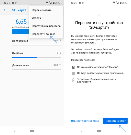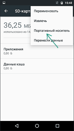 Після завершення форматування, вийдіть з adb shell, а на телефоні, в параметрах сховища відкрийте пункт «SD-карта», натисніть на кнопці меню праворуч вгорі і натисніть кнопку «Перенести» (це обов’язково, інакше продовжить використовуватися внутрішня пам’ять телефону). По закінченні перенесення процес можна вважати завершеним.