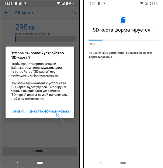 - Прочитайте попередження про те, що всі дані з картки будуть видалені, перш ніж її можна буде використовувати в якості внутрішньої пам’яті, натисніть «Очистити та форматувати».