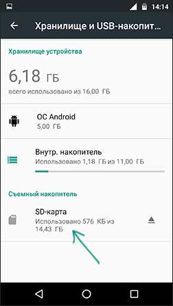 - Зайдіть в Настройки — Сховище і USB-накопичувачі і клацніть по пункту «SD-карта» (На деяких пристроях пункт налаштувань накопичувачів може знаходиться в розділі «Додатково», наприклад, на ZTE).