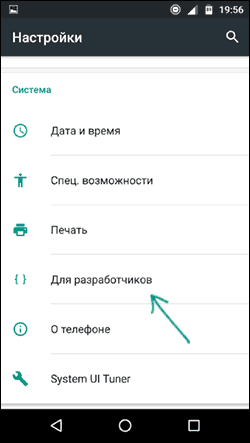 Тепер у меню «Налаштування вашого телефону з’явиться новий пункт «Для розробників» і можна переходити до наступного етапу (може бути корисно: Як включити і вимкнути режим розробника на Android).
