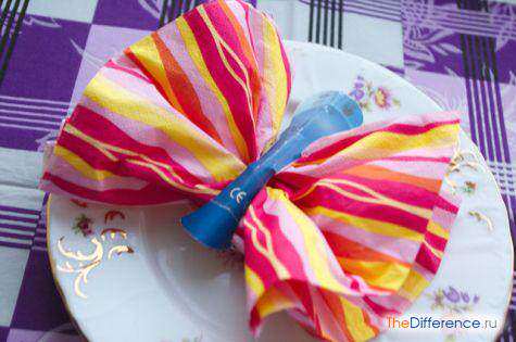 Очевидно, що жодне застілля не обходиться без серветок. Вони повинні виступати органічним доповненням скатертини і посуду. Можна помістити яскраві серветки під тарілки або поруч з ними. При бажанні можна використовувати і однотонні тканинні серветки, прикрашені яскравими термоаппликациями. Подібні елементи декору продаються в будь-якому швейному відділі. Досить розташувати наклейку на тканини і провести по ній гарячою праскою, щоб отримати веселий атрибут сервірування. Красиво прикрасити дитячий стіл допоможуть також оригінальні паперові «шедеври» з серветок у вигляді квітів, фігурок тварин і комах (фото).