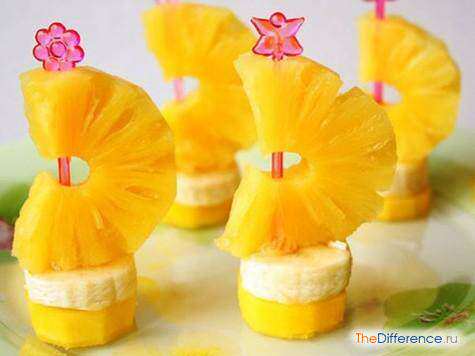 Ще один безпрограшний варіант – прикрасити фруктами дитячий стіл, виклавши з них різноманітні красиві композиції. Так, бананові пальми і яблучні ялинки будуть виглядати на тарілках дуже ефектно. Дуже популярною стравою на святковому столі виступає і фруктовий салат. Зовсім не обов’язково подавати його в скляному посуді, коли можна використовувати більш оригінальну ємність. Індивідуальна тарілка-диня або піала з апельсина будуть сприйняті дітьми дуже прихильно. А фруктові канапе, увіткнені в м’якоть кавуна, стануть коронною стравою дня. До слова сказати, від шкірки цитрусових плодів можна використовувати в якості підкладок для різнобарвного желе (фото).