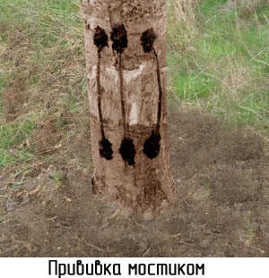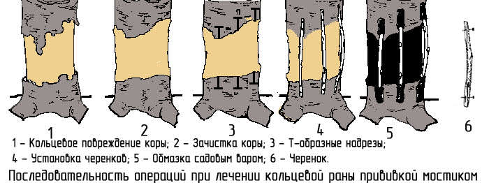 Таку рану лікують, застосовуючи щеплення містком. Приступають до цього щеплення з початком сокоруху, яке збігається з розпусканням листя. Краї рани вирівнюють, підрізаючи кору садовим ножем, намагаючись не пошкодити деревину. Вище і нижче рани на корі роблять Т-подібні розрізи довжиною 2-3 см, в які вставляють живці, зрізані з цього ж або іншого дерева-донора.