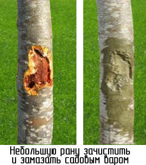 Невеликі рани і не мають кільцевий характер досить зачистити і замазати садовим варом або глиною, змішаною з коров’яком і шерстю. По краях рани досить швидко утворюється наплив, який її поступово затягує.