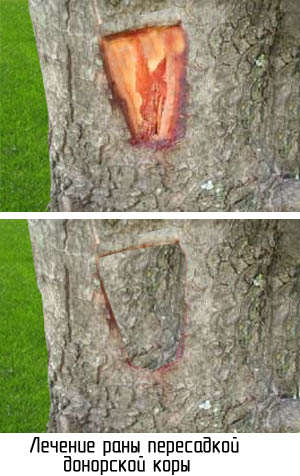 Великі рани лікують, пересаджуючи шматок кори, зрізаний з іншого дерева або гілки. Роблять це на початку сокоруху наступним чином: краї рани обрізають до свіжої непошкодженій кори, з цього зрізу роблять шаблон, приклавши аркуш паперу до рани і обвівши його олівцем.