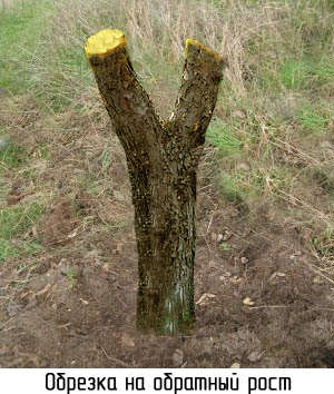Обрізка на зворотний ріст. Її роблять у разі коли з-за сильних морозів вся крона загинула, а частина штамба, укрита снігом збереглася. При цьому крону зрізають до здорової деревини, після чого залишається пеньок, зрізану поверхню замазують садовим варом.