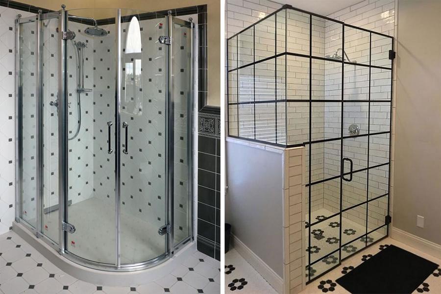 - Тип и материал. Существуют поддоны из акрила, эмалированного металла, искусственного мрамора и чугуна. Створки можно подобрать из прозрачного или матового пластика, стекла. По форме различают прямоугольные, полукруглые, эллипсовидные и пятиугольные поддоны. Есть компактные модели в форме четверти круга, которые идеально становятся в угол комнаты.