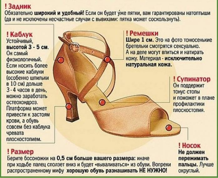 При виборі взуття віддавайте перевагу моделям з платформою. У них п’ята буде менше підніматися, що забезпечить комфорт під час тривалої ходьби. Носок бажано вибирати округлий. В туфлях з загостреним мисом пальці не повинні здавлюватися, вільно розташовуючись всередині. У такому взутті навіть після тривалої прогулянки ноги не втомляться, вам не доведеться робити перерви.