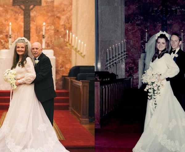 Керолін і Келлі Гей нещодавно відзначили 50-річчя з дня весілля. Щоб як слід запам’ятати торжество, вони вирішили відтворити пам’ятний день 1971 року, коли дали один одному клятви біля вівтаря. Заради такого випадку Керолін три роки відрощувала волосся, а на фотосесію одягла той же самий вінчальний наряд, який був на ній півстоліття тому, інформує Ukr.Media.