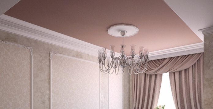 - Выбрать пленку светлого тона. Так классический белый матовый натяжной потолок вряд ли «отнимет» много места, как и бежевый, светло-голубой, сиреневый или любой другой светлый пастельный оттенок.