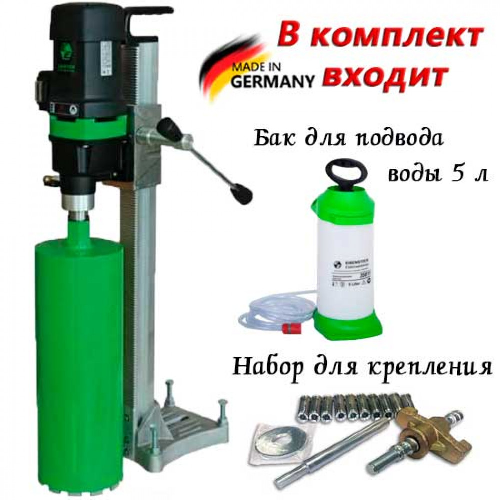 Алмазное бурение предполагает использование дрели с алмазными коронками. При необходимости инструмент устанавливают на специальные установки – стойки. Дрели можно использовать как ручной инструмент для сверления в труднодоступных местах или в комплекте со штативом. При ручном использовании коронки могут подвергнуться деформации, что приведет к уменьшению срока их годности.
