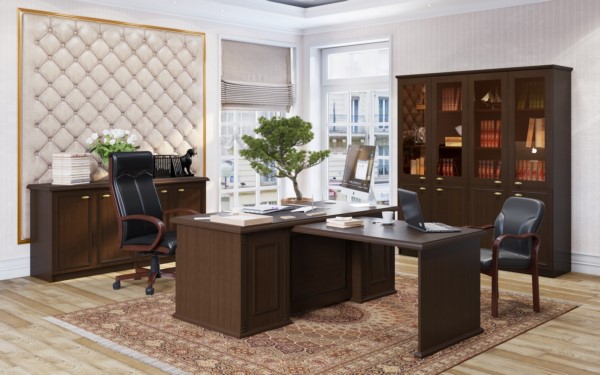 - Расцветку мебели выбирают обычно в темных тонах, так как это подчеркивает рабочую обстановку в кабинете. Но, опираясь все же в первую очередь на предпочтения руководителя.