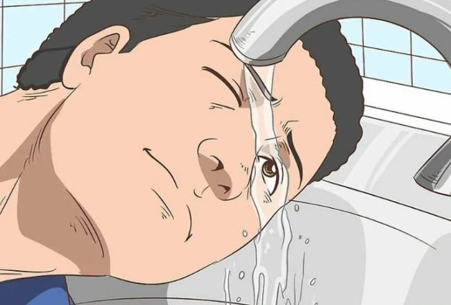 - Можна виконати процедуру у раковині. Якщо голова знаходиться під краном, поверніть її убік. Увімкніть теплу воду, дозвольте рідині потрапляти у вічі. При низько розташованому крані потрібно взяти глечик. Нахиліть голову набік і полийте воду, щоб вона текла в очі.