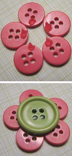 Викладаємо на робочий стіл невеликі гудзички, які будуть зображати пелюстки квіточки майбутнього. Капаємо на них клеєм і зверху прикладаємо гудзик побільше. Щоб замаскувати дірочки середньої гудзики, приклейте зверху яку-небудь маленьку красиву гудзик (краще всього підійде пуговка незвичайної форми або ґудзик на ніжці, яку треба буде зрізати кусачками, також можна використовувати гарну намистину).