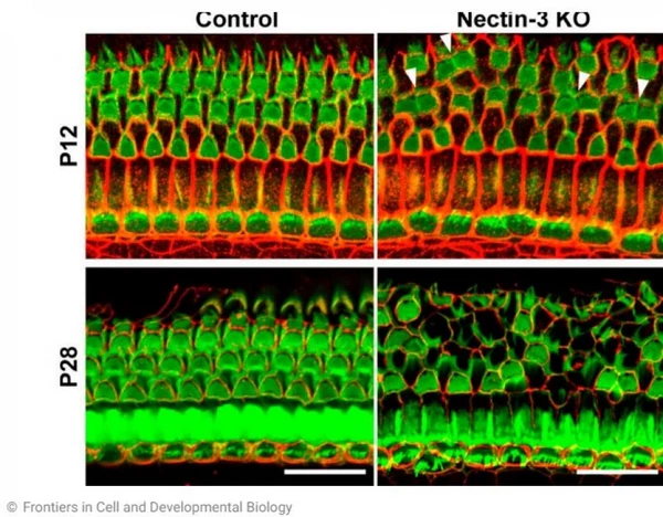 В експериментах з мишами вони запобігли формуванню ступінчастої гратчастої структури, зупинивши експресію одного типу нектину (нектин-3). Результати показали, що у цих мишей розвинулася часткова втрата слуху, незважаючи на однакову загальну кількість клітин волосся в корі головного мозку при народженні.