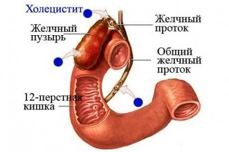 Для гострого холециститу властиві хворобливі відчуття, що віддають в інші частини тіла, а також блювота з вмістом жовчі. Спочатку відчуття болю локалізується в підреберній частини праворуч, поступово збільшуючись, починається жар.