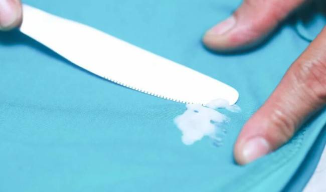 - Акуратно зіскребіть надлишки, потім покладіть під пляма вбирає прокладку і промийте плямо вивідником.