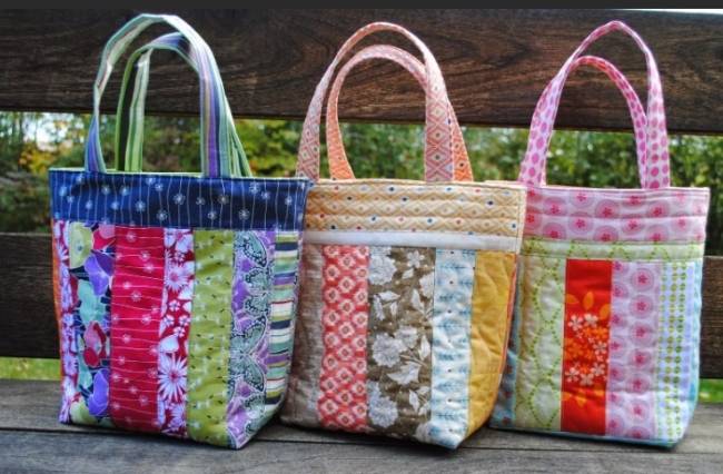 Там, де буде верх сумки, просуньте кінці однієї з ручок між двома шматками тканини так, щоб кінці ручок виявилися затиснутими між шматками тканини. Скріпіть шматочки разом, щоб все було на місці, і прошийте верхній шов сумки, щоб закріпити ручку. Повторіть цей процес для іншої половини сумки. Потім візьміть дві половинки сумки і скріпіть їх разом підкладкою назовні. Прошийте нижні і бічні шви і виверніть готову сумку правою стороною назовні.