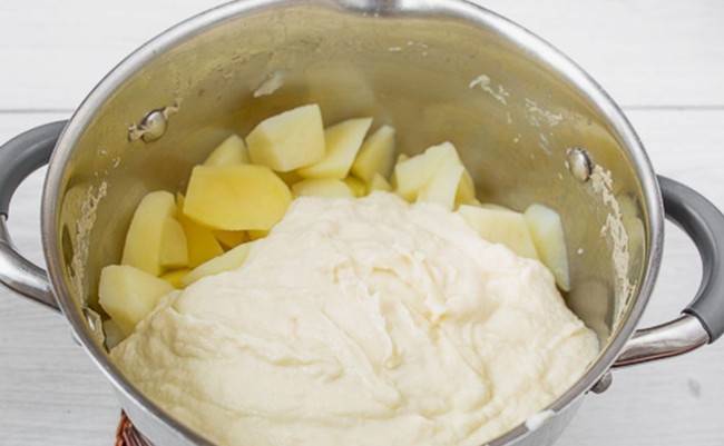 - Злийте воду і поверніть картоплю в каструлю, розімніть. Зменшіть вогонь до мінімуму. Додайте інші інгредієнти, прогрійте до теплого стану. Так пюре вийде більш повітряним.