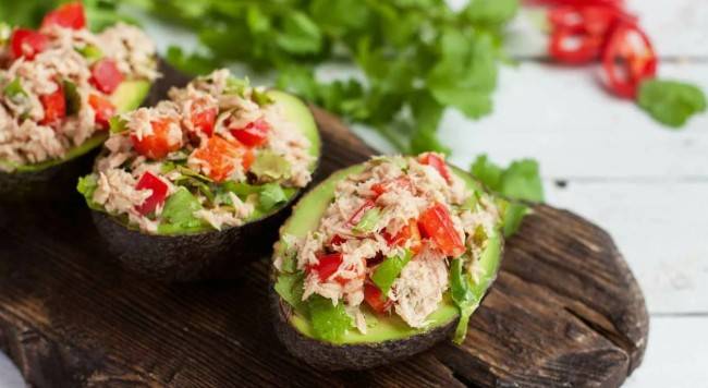 - Авокадо розріжте навпіл, приберіть кісточки. За потреби трохи ложкою видаліть м’якоть, щоб збільшити заглиблення для начинки.