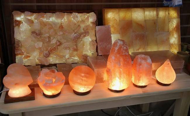Соляні лампи виготовляють із кристалів рожевої солі, видобутої недалеко від Гімалаїв. Всередину поміщається лампочка, що дає приємне бурштинове світло.