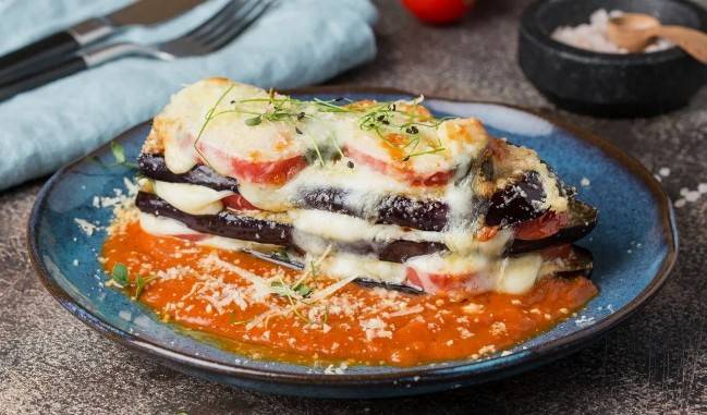 - Помістіть обсмажені скибочки баклажанів у форму для запікання, додайте свіжу петрушку, полийте соусом маринара.
