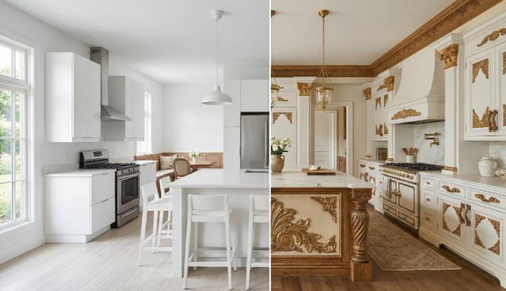 Класика — акантовий лист, рослинні завитки, квіткові гірлянди. Підходить для інтер’єрів із ліпниною, паркетом, класичними меблями.