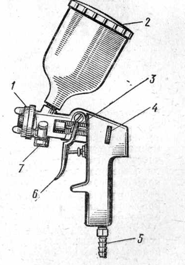 6 — курок, 7 — місце приєднання штуцера для фарби.