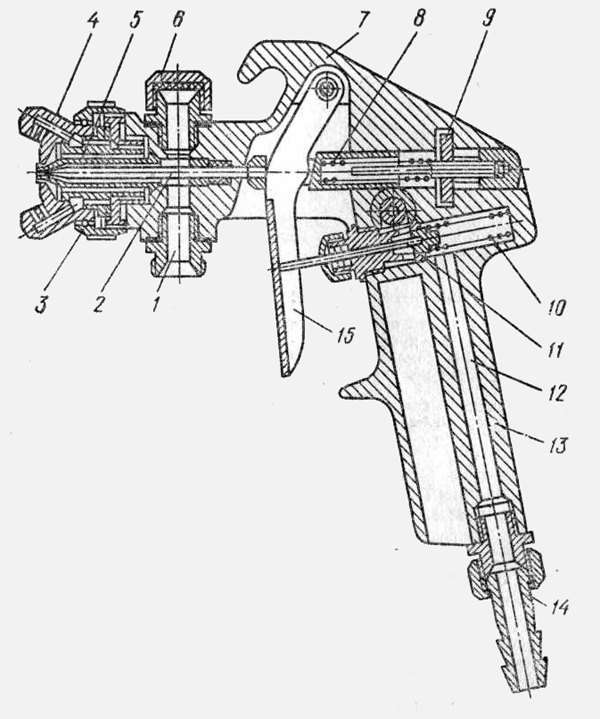1 — ніпель для підвісного унітазу з фарбою або штуцера зі шлангом від бака з фарбою, 2 — голчастий клапан, 3 — кріпильна гайка, 4 — насадка, 5 — сопло, 6 — пробка, що закриває отвір для склянки з фарбою, 7 — корпус, 8 — пружина голчастого клапана, 9 — регулятор ходу голки, 10 — пружина, 11 — клапан — регулятор надходження стисненого повітря, 12 — канал для стисненого повітря, 13 — рукоятка, 14 — штуцер для шланга, що підводить стиснене повітря, 15 — курок.