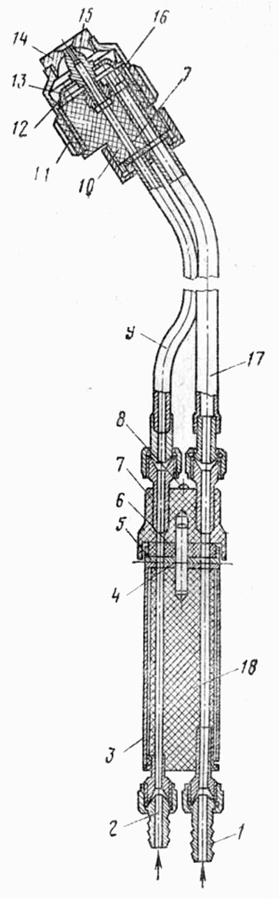 1 — ніпель для шпаклівки, 2 — ніпель для повітря, 3 — корпус рукоятки, 4 — рухомий диск, 5 — нерухомий диск, 6 гумовий демпфер, 7 — головка, 8 натяжний гвинт, 9 — трубка для повітря, 10 — корпус головки, 11— кришка, 12 — манжета, 13 — шайба, 14 — ніпель для розпилення, 15 — сопло, 16 — матеріальний дросель, 17 — трубка для шпаклівки, 18 — рукоятка.