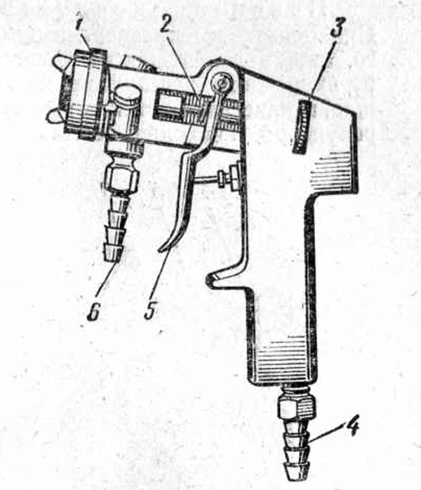 4 — штуцер подачі стисненого повітря, 5 — курок, 6 — штуцер подачі барвистого складу.