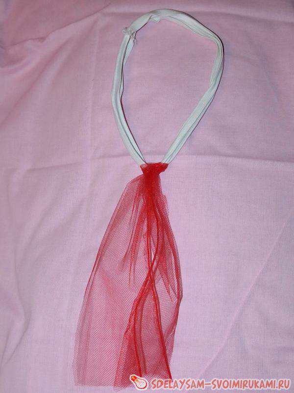 Тепер необхідно взяти гумку, зшити її щоб вийшло кільце. Взяти 1 смужку фатину, скласти навпіл, обернути щоб вийшла петля і протягнути залишився хвостик. Затягнути «вузлик». Прикріпити також всі інші фатиновые смужки.