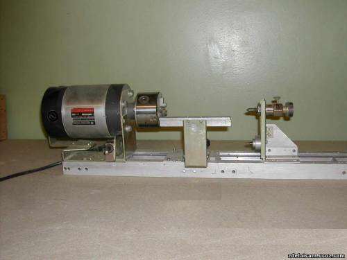 Токарний верстат для дерева. Мотор ПІК 12-3/10.1 від болгарського магнітофона/ накопичувача. Патрон польський, до 150 мм. Права бабка з обертовим центром і подачею на 20 мм. Супорт фіксується, переміщається по горизонталі. Точу на ньому ручки для напилків, дрібниця сільничок, гудзиків. Супорт вийшов слабкий, вібрує на твердому дереві, буду переробляти.