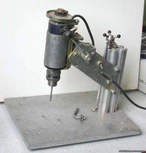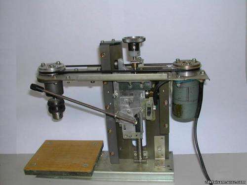 Свелильный верстат під патрон 2а. Стійка з аллюминиевого профілю в ньому черв’ячна передача, з її допомогою каретка на підшипниках переміщається на 80 мм під свердла різної довжини. Ручкою перещается власне мотор ще на 20 мм. Вгорі на осі двигуна – абразивний диск для доведення свердел, захищений рамкою. Мотор болгарська, від магнітофона, профіль від вітрини, черв’як від водопровідного вентиля, підшипники від висувного столика.