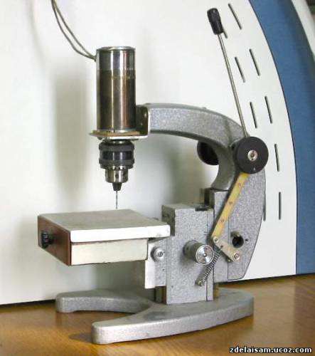 Свердлильний верстат з цангові патрони на 0,8 мм. Зроблений із залишків механізму, який називався “прес для виготовлення алюмінієвих бірок”. Двигун ДПР-52, вісь я подовжив тільки для краси всієї конструкції. Хід свердла – 20 мм. Видно коробка для свердел і абразивний диск на осі движка вгорі для правки свердел.