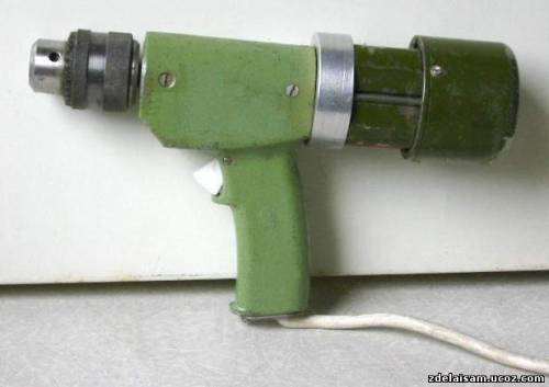 Рукоять з механізмом від пневмодрилі. Мотор передає обертання на турбіну, насаджений через перехідне кільце. У корпусі дриля вже знаходиться планетарний редуктор приблизно 3:1. Дуже потужна машинка. Потрібні токарні роботи: перехідне кільце, втулка на валу, підгонка конуса Морзе під розмір 2а. Важко було встановити сильнотоковую кнопку.