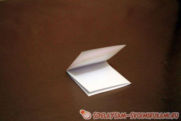 Отже, спочатку беремо аркуш паперу (найзручніше взяти готові листки для записів – вони квадратні і краще підходять за розміром) і складаємо його навпіл.