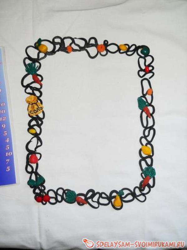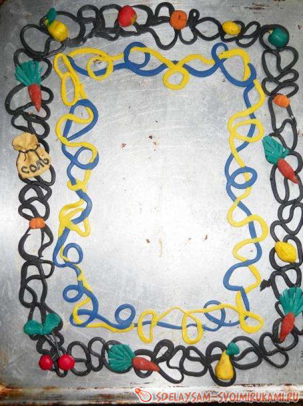 Потім приступаємо до оформлення рамки. З полімерної глини робимо джгутики одного або двох кольорів, і маємо в хаотичному порядку, переплітаючи один з одним. Розкладаємо по периметру аркуша і поміщаємо на лист для температурної обробки.