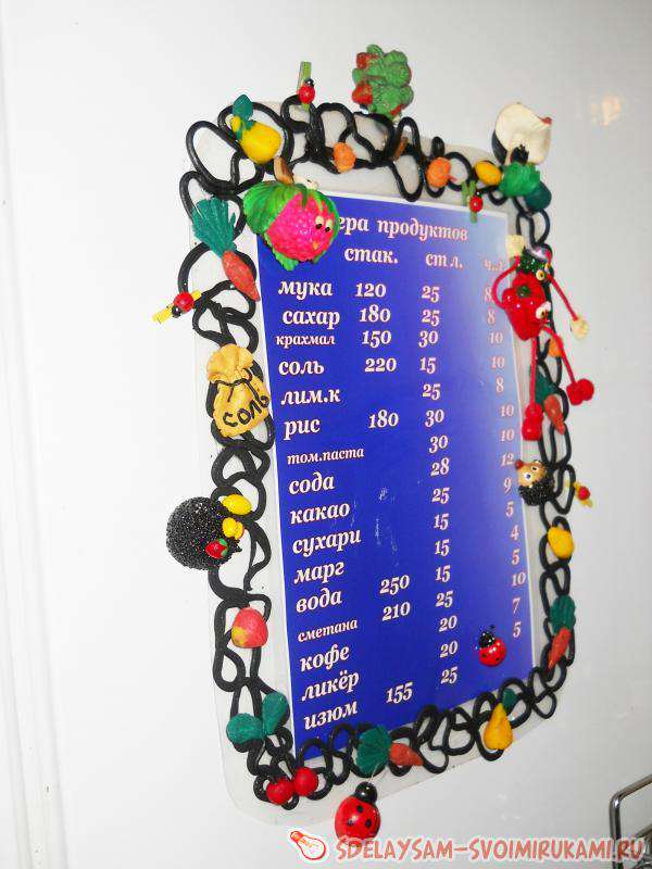 Жінка проводить на кухні багато часу, якщо вона воліє здорову їжу, любить радувати своїх близьких смачними стравами, і отримує задоволення від процесу. Зручно організоване робоче місце має бути не тільки в офісі. Домашня робота також вимагає певного порядку і набагато зручніше пекти пироги, якщо все під рукою. В наш час засилля напівфабрикатів ми все рідше готуємо вдома, забуваючи, як пахне домашня випічка. Для тих, хто не лінується стояти біля плити, стане в нагоді шпаргалка у вигляді рамочки, яку можна зробити своїми руками з полімерної глини.