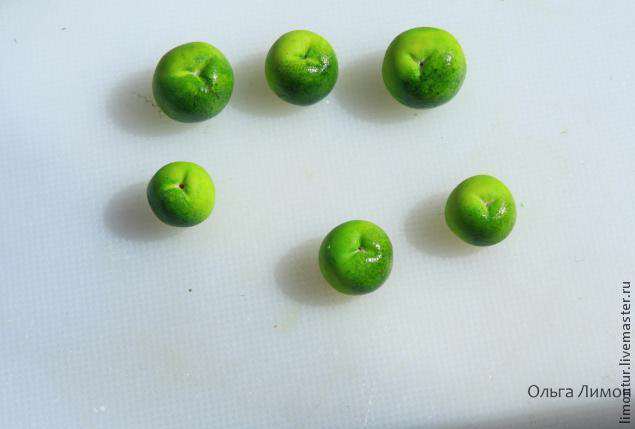 Потім у кожній заготівлі яблучка зробимо невеликий отвір для плодоніжки фрукта. Так само наносимо три виїмки, які будуть позначати опуклості яблука і додадуть йому більш натуральний вигляд На фото, розташованому нижче, автор ще не зробив виїмки, вони добре помітні на наступних фотографіях. Зверніть на це увагу, так як це важлива деталь, яку потрібно робити, поки маса не затверділа.