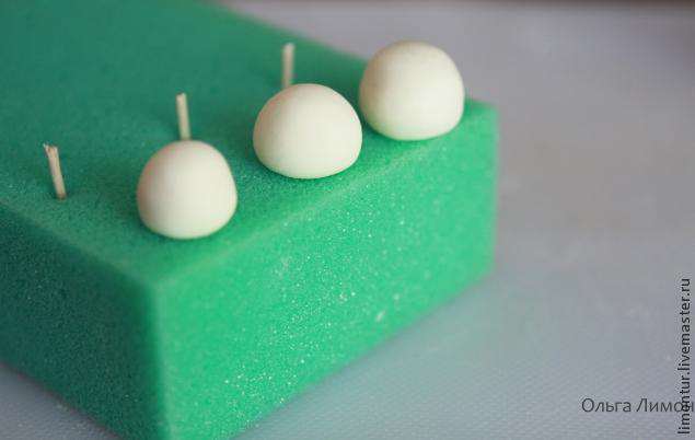 Тепер обережно наколюємо круглі заготовки майбутніх яблучок на зубочистки. Поролонова губка зручна тим, що на ній заготовки сохнуть і практично не прилипають до поверхні.