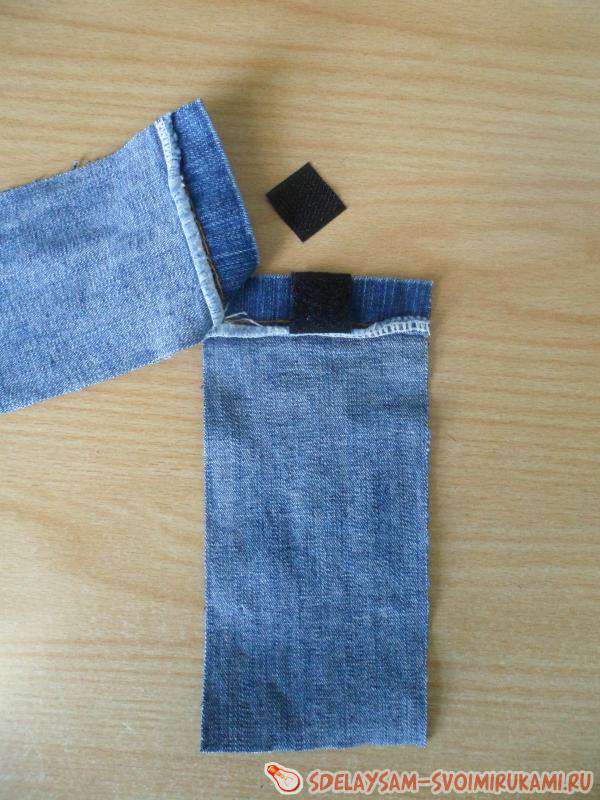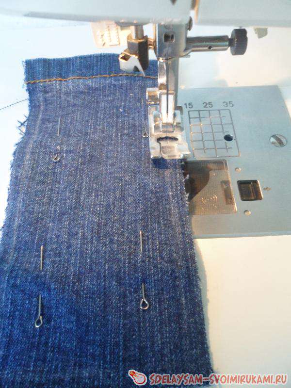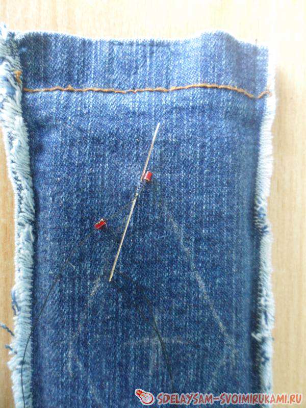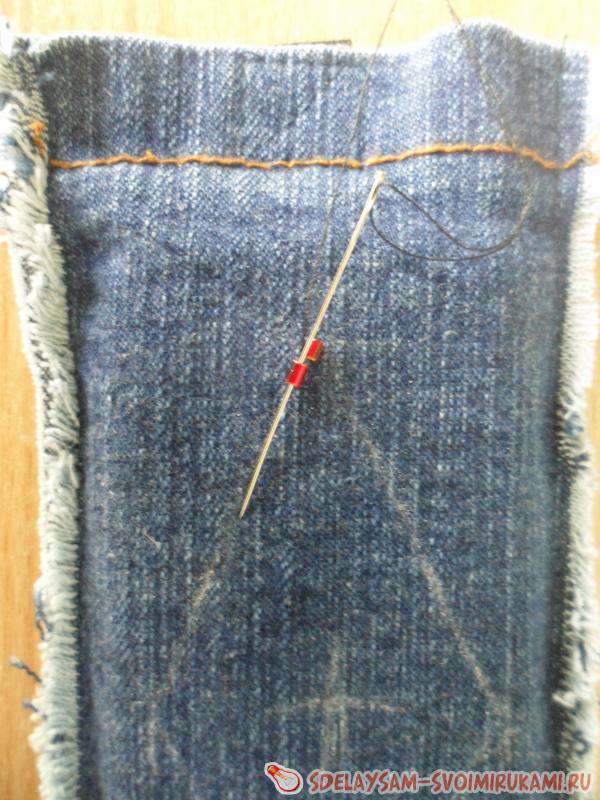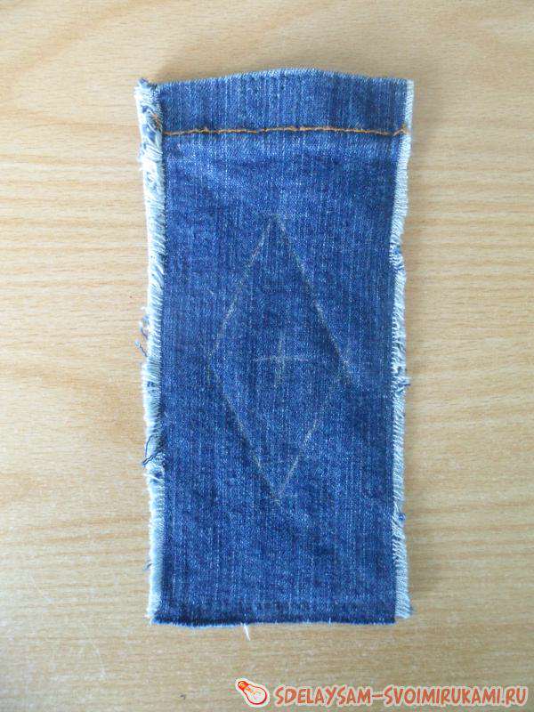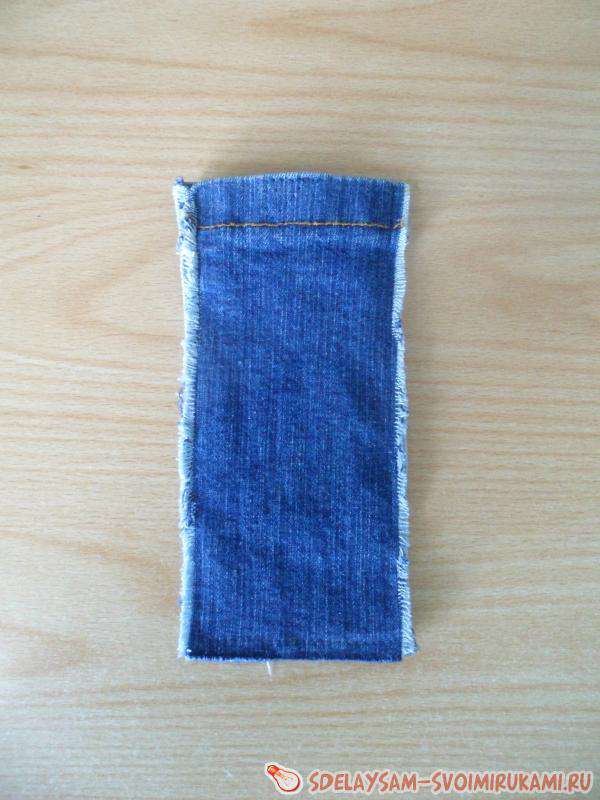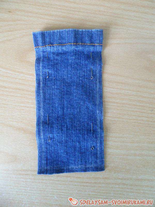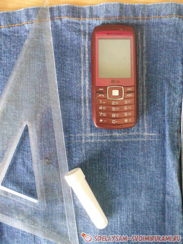 Розкладаємо джинси, вирівнюючи край по низу. Кладемо телефон, відступивши трохи від крайньої рядки вниз, як показано на рисунку. Відкладаємо по 0,5 см з кожного боку телефону та проводимо прямі лінії за допомогою лінійки і крейди. Потім, відступивши ще 0,5 см від цих ліній, проводимо паралельні.