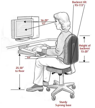 Щоб знизити навантаження на наш організм, існують спеціально розроблені правила роботи за комп’ютером. Вони передбачають набір рекомендацій по вибору робочого місця, меблів (столи і стільці), комп’ютерної техніки (монітора, клавіатури, мишки і так далі), а також комплекс норм, які обумовлюють положення тіла під час роботи.