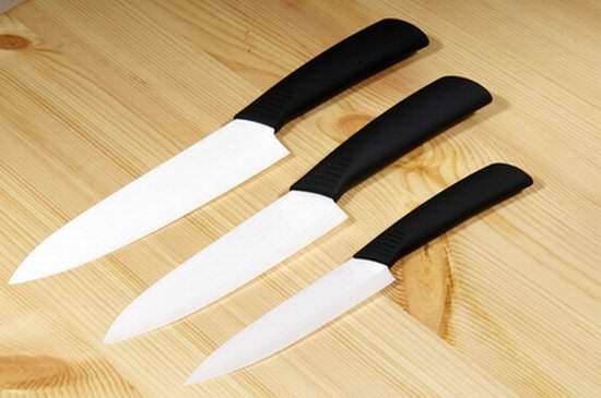 З’явилися в продажу зовсім недавно і відразу зайняла одне з лідируючих місць у рейтингу ножів. Ці ножі легше металевих, створюється відчуття, що ніж ковзає при нарізці, немає необхідності кілька разів проводити по одному місцю – «пиляти». Леза бувають від 8 до 18-20 см, так що без праці можна вибрати необхідний. Переваги: дуже гострий, при правильному догляді прослужить довго. Відмінно ріже сирі овочі і фрукти, а м’ясо, навіть розтануло, виходить акуратними кубиками, а не безформними шматками. Не вимагає заточування. Але є і недоліки: в першу чергу, дуже висока ціна. Тендітні – не можна кидати або кидати в раковину. Не рекомендується різати заморожене м’ясо і рибу, а також м’ясо, де можуть бути кістки. Категорично не можна використовувати на скляних дошках – лезо фарбували. З – за дуже гострого леза рекомендується мити з боку «спинки», інакше є шанс сильно поранитися.