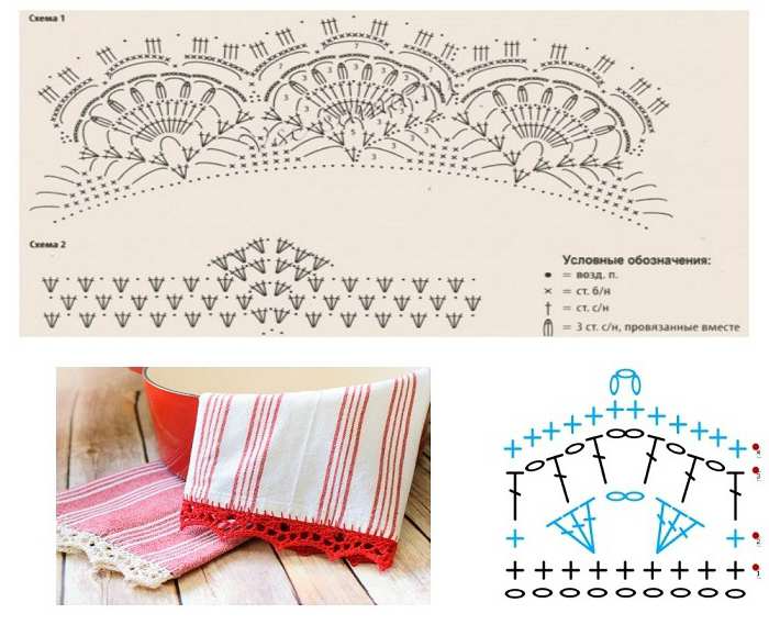 Фактура і виразність обробки залежать від призначення обвязываемого предмета або речі. Не для всіх аксесуарів підходить проста обв’язка країв гачком. Схеми більш складного порядку наведені нижче і можуть бути використані для декору покривал, шалей і банних лляних рушників.