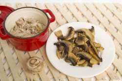 Запікаємо 20 хвилин. Температура 180 градусів. Щоб під час запікання рідина з кокотниць не витікала і не подгорала, наливаємо в деко гарячу воду. Кілька маленьких печериць обсмажуємо, розрізавши навпіл, прикрашаємо жюльєн.