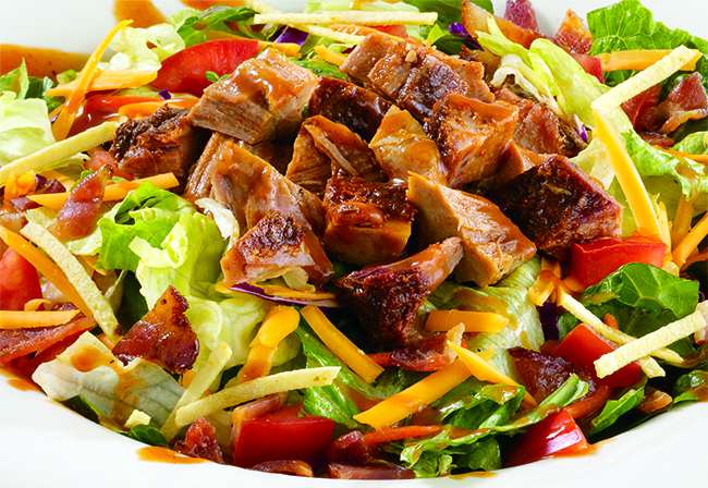 - Для приготування наступної страви вам знадобиться 350 г консервованої квасолі, 350 г копченої курячої грудинки, 300 г бринзи, три помідори і пучок листя салату. Інгредієнти подрібніть і покладіть в салатницю. Для соусу з’єднайте сік лимона і оливкову олію. Перемішайте всі складові, а перед подачею посипте блюдо сухариками.