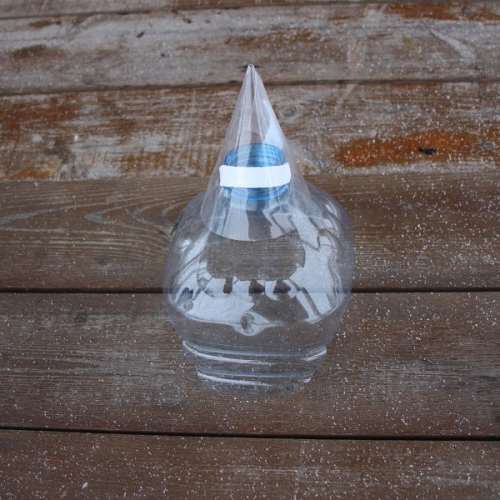 Відріжте від пляшки її верхню частину і виготовте з неї основу для майбутньої вироби. Можете зробити її передню область рівною або вирізати на ній довгасту пластину, що закриває ніс. Змайструєте з склянки конусоподібну насадку на шолом.